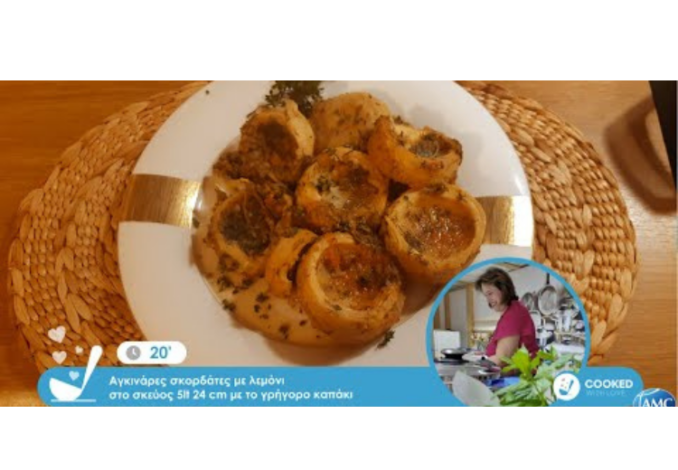 Παίρνουμε το σκεύος 5lt 24cm και βάζουμε το μάτι της κουζίνας στο 7. Βάζουμε μέσα το κρεμμύδι και το σκόρδο, πολτοποιημένο και το λάδι. Ανακατεύουμε και βάζουμε μέσα και τις αγκινάρες.