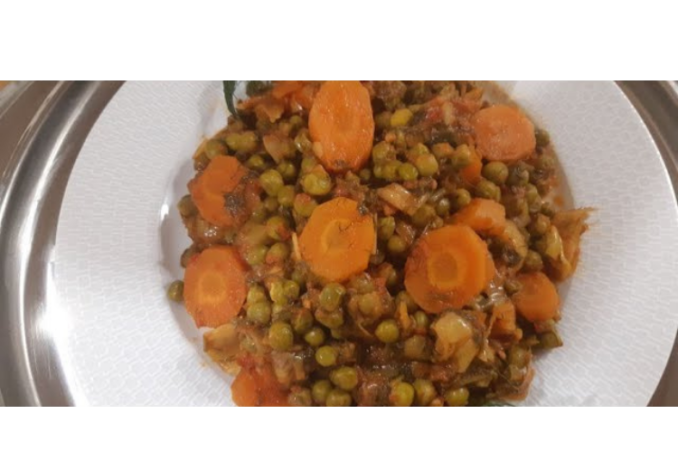 Προσθέτουμε τον αρακά, τα καρότα, την λιωμένη φρέσκια ντομάτα, τον πελτέ, τον άνηθο, τον κουρκουμά, τον μαϊντανό, αλάτι και πιπέρι και ανακατεύουμε καλά γιατί δεν θα προσθέσουμε νερό.