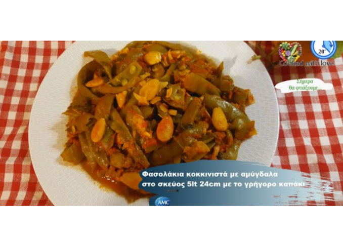 Με το μάτι στο 7, τσιγαρίζουμε τα κρεμμύδια. Μόλις πάρουν χρυσό χρώμα, προσθέτουμε όλα τα υπόλοιπα υλικά εκτός από τα φασολάκια. Αφού πάρουν μια βράση, προσθέτουμε τα φασολάκια.