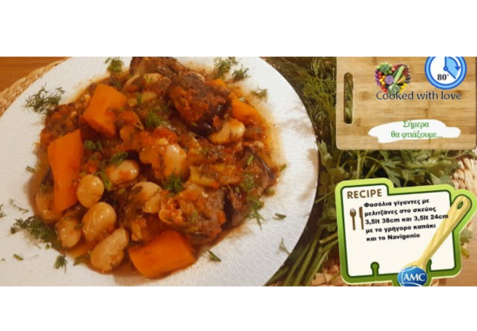 Στο σκεύος 38cm προσθέτουμε τις μελιτζάνες, τους γίγαντες, και την σάλτσα. Μαγειρεύουμε στο 2 για 20’.