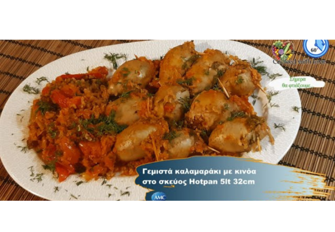 Γεμίζουμε τα καλαμαράκια με την γέμιση και κλείνουμε με οδοντογλυφίδες. Προσθέτουμε τα γεμιστά καλαμαράκια στο τηγάνι, με όλα τα υπόλοιπα υλικά. Ανοίγουμε το μάτι στο 7 και ρυθμίζουμε 40’ το audiotherm στην ένδειξη ‘καρότο’. Μόλις η πρώτη κόκκινη ένδειξη φτάσει στην ένδειξη ‘μπριζόλα’ χαμηλώνουμε στο 2 και μαγειρεύουμε για 40’.