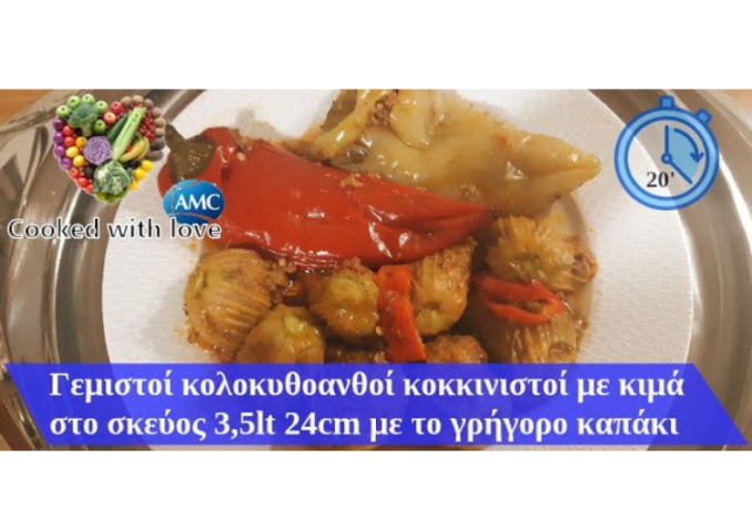 Κολοκυθοανθοί: Γεμίζουμε τον κάθε κολοκυθοανθό με 1-1 ½ κουταλιά της σούπας γέμιση, και τους τοποθετούμε μέσα στο σκεύος κυκλικά με το άνοιγμα προς τα κάτω. Αν μας περισσέψει κιμάς, γεμίζουμε 2-3 πιπεριές και τις προσθέτουμε πάνω από τους κολοκυθοανθους – εξαρτάται από το μέγεθος των κολοκυθοανθών που θα βρείτε.