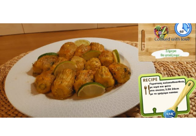 Κλείνουμε το sec quick και βάζουμε το μάτι στο 9. Ρυθμίζουμε το audiotherm για 10’ στην ένδειξη ‘turbo’. Μόλις ο πρώτος κόκκινος δείκτης φτάσει στην ένδειξη ‘soft’ χαμηλώνουμε στο 2. Μόλις ο δεύτερος κόκκινος δείκτης φτάσει στην ένδειξη ‘turbo’ μαγειρεύουμε για 10’. Περιμένουμε όλοι οι δείκτες να γυρίσουν στην αρχική τους κατάσταση και ανοίγουμε το καπάκι. Γεμίζουμε τους ανθούς με κιμά και φέτα και τους τοποθετούμε στο σκεύος.