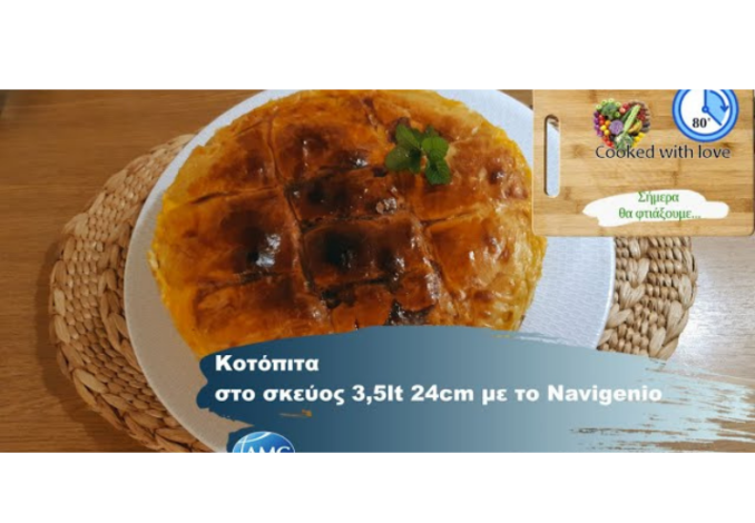 Βάζουμε χαρτί ψησίματος στο πάτο του σκεύους και το 1 φύλλο κουρού, προσθέτουμε την γέμιση, από πάνω το 2ο φύλλο κουρού και αλείφουμε με το 2ο αυγό. Κόβουμε την πίτα σε κομμάτια, ανοίγουμε το μάτι της κουζίνας στο 2 ή 3 και ρυθμίζουμε navigenio στο πρώτο πεδίο για 50’.