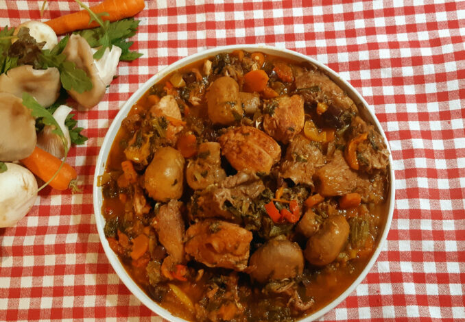 Βάζουμε μέσα τα σκόρδα και συνεχίζουμε να τσιγαρίζουμε τα μανιτάρια. Βάζουμε μέσα το κοτόπουλο και τον πελτέ και ανακατεύουμε. Το αφήνουμε λίγα λεπτά και μετά βάζουμε το ξερό πολτοποιημένο κρεμμύδι και το φρέσκο. Τα τσιγαρίζουμε για λίγο όλα μαζί και μετά σβήνουμε με το κόκκινο κρασί. Μόλις εξατμιστεί το αλκοόλ βάζουμε τα υπόλοιπα υλικά εκτός από τις ελιές.