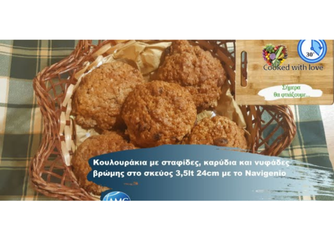 Προθερμαίνουμε το σκεύος στο 7, και ρυθμίζουμε το audiotherm στη μπριζόλα. Προσθέτουμε αντικολλητικό χαρτί στο πάτο του σκεύους, πλάθουμε και προσθέτουμε τα κουλούρια. Κατεβάζουμε το μάτι στο 2, και ρυθμίζουμε 35’ στο 1 πεδίο του navigenio.