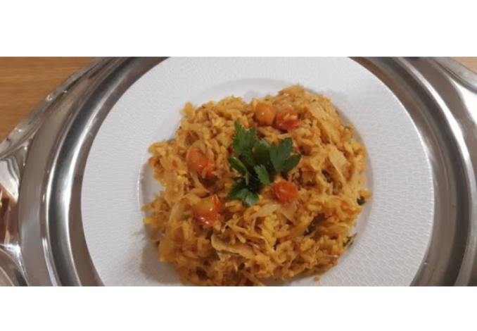 Στην συνέχεια, προσθέτουμε λιγο-λιγο το τριμμένο λάχανο, την ντομάτα λιωμένη, τον πελτέ και ανακατεύω. Προσθέτουμε το σέλινο, αλάτι, πιπέρι, τον κουρκουμά, το θυμάρι, το ρύζι και το νερό, και ανακατεύουμε καλά. Βάζουμε τα μικρά ντοματινια από πάνω, δυναμώνουμε το μάτι στο 9 και κλείνουμε με το γρήγορο καπάκι.