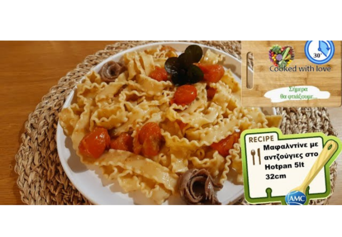 Προθερμαίνουμε το σκεύος στο 7, και ρυθμίζουμε το audiotherm στη ‘μπριζόλα’. Τσιγαρίζουμε το ελαιόλαδο με το σκόρδο και προσθέτουμε τις αντζούγιες. Σβήνουμε με το κρασί και περιμένουμε να εξατμιστεί το αλκοόλ. Βγάζουμε το σκόρδο, και προσθέτουμε τα κρεμμύδια, τα ντοματίνια, και σιγά σιγά τα μυρωδικά.
