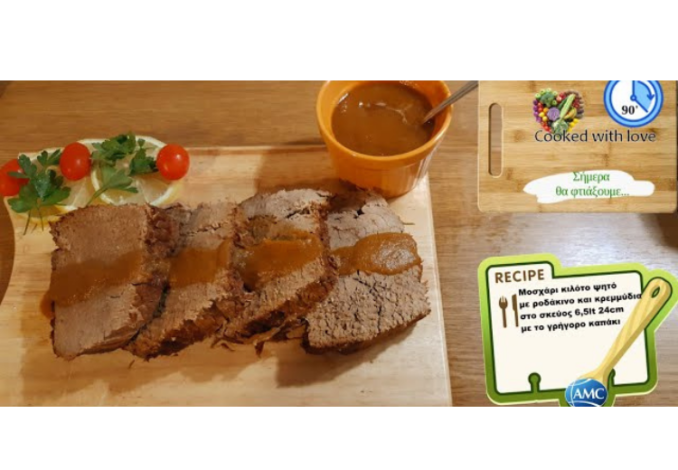 Προσθέτουμε όλα τα υπόλοιπα υλικά. Βάζουμε το μάτι στο 9 και κλείνουμε με το sec quick. Ρυθμίζουμε το audiotherm για 60’ στην ένδειξη ‘turbo’. Μόλις ο πρώτος κόκκινος δείκτης φτάσει στην ένδειξη ‘soft’ χαμηλώνουμε στο 2. Μόλις ο δεύτερος κόκκινος δείκτης φτάσει στην ένδειξη ‘turbo’ μαγειρεύουμε για 60’. Περιμένουμε όλοι οι δείκτες να γυρίσουν στην αρχική τους κατάσταση και ανοίγουμε το καπάκι. Βγάζουμε το μοσχάρι και το κόβουμε σε φέτες. Λιώνουμε την σάλτσα στο μπλέντερ και περιχύνουμε.