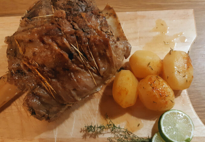 Βάζουμε τις πατάτες σε ένα μπωλ και ρίχνουμε το αλάτι και το πιπέρι. Τις αφήνουμε 5 λεπτά. Ανακατεύουμε το χυμό από 2 λεμόνια με την υπόλοιπη μουστάρδα και το ρίχνουμε πάνω από τις πατάτες. Ανακατεύουμε καλά τις πατάτες και τις αφήνουμε μισή ώρα και μετά τις βάζουμε μέσα στο κρέας που ήδη έχει ψηθεί μία ώρα.