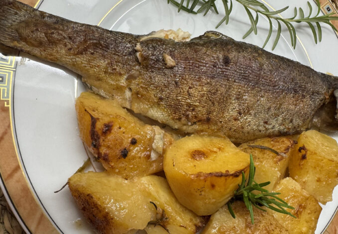 Τα περιχύνουμε πάνω στις πατάτες. Προσθέτουμε τις πέστροφες.
