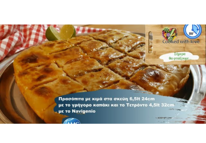 Σε ένα μπολ ανακατεύουμε τον κιμά με τα τυριά. Παίρνουμε το τετρόντο και βάζουμε χαρτί ψησίματος στον πάτο, στη συνέχεια το ένα φύλλο ζύμης, το μείγμα, και από πάνω το δεύτερο φύλλο ζύμης. Αλείφουμε με το μείγμα αυγού, χαράζουμε σε κομμάτια, βάζουμε το σκεύος στο μάτι. Ρυθμίζουμε 50’ στο navigenio sto 2o πεδίο και το μάτι της κουζίνας στο 3 ή 4 για 40’.