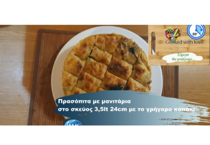 Προθερμαίνουμε το σκεύος 5lt στο 7, και ρυθμίζουμε το audiotherm στη ‘μπριζόλα’. Ανοίγουμε και προσθέτουμε το ελαιόλαδο και μανιτάρια να σοταριστούν. Προσθέτουμε τα πράσα, τα κρεμμύδια, τις πιπεριές, τα ντοματίνια και τα μυρωδικά ψιλοκομμένα.