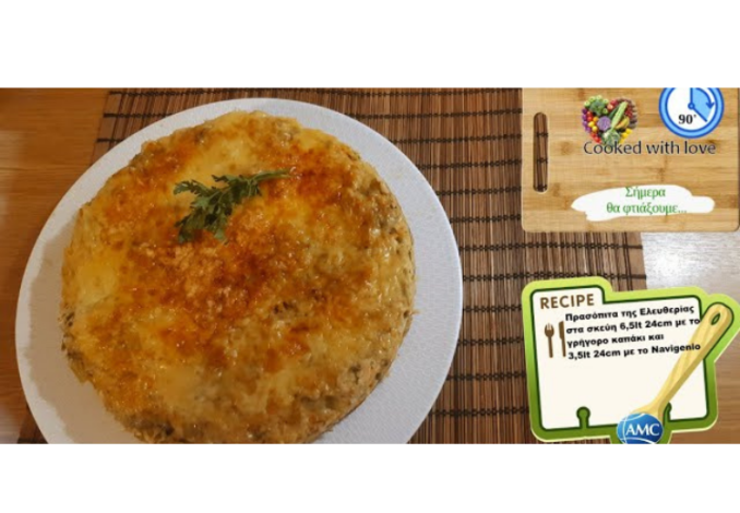 Αφήνουμε την γέμιση να κρυώσει λίγο για να μην ψήσουμε τα αυγά, και προσθέτουμε όλα τα υλικά για την πίτα και ανακατεύουμε καλά (μόνο τα 200γρ reggato). Προσθέτουμε στον πάτο του 3.5lt χαρτί ψησίματος, και προσθέτουμε την γέμιση. Βάζουμε το μάτι στο 2 και το navigenio από πάνω στο 1ο πεδίο για 35’. Μετά τα 10’ ανοίγουμε και προσθέτουμε από πάνω 100γρ reggato. Συνεχίζουμε το ψήσιμο.
