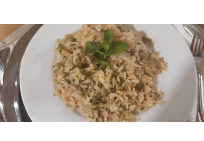 Αφού έχει μαραθεί το κρεμμύδι το φρέσκο, το πράσο, βάζουμε το ζωμό λαχανικών, αντί για νερό. Βάζουμε και τα υπόλοιπα υλικά. Το ρύζι (καστανό), το αλάτι, το κουκουνάρι, το μαϊντανό, το φρέσκο δυόσμο, και την αποξηραμένη ρίγανη. Ανακατεύουμε καλά και βάζουμε και λίγο φρέσκο πιπέρι.
