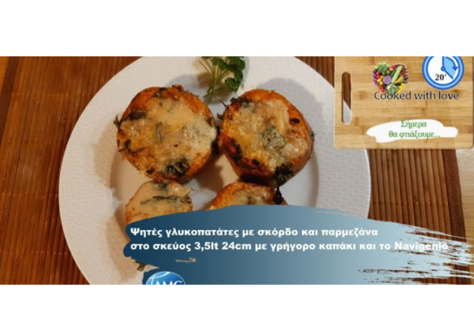 Βάζουμε στον πάτο του σκεύους χαρτί ψησίματος και τις γλυκοπατάτες. Πάνω από τις πατάτες βάζουμε το σκόρδο πιπέρι και βούτυρο. Βάζουμε από πάνω το navigenio στο τελευταίο 2ο πεδίο για 10’. Προσθέτουμε την παρμεζάνα, μαϊντανό και ρυθμίζουμε το navigenio για 2’.