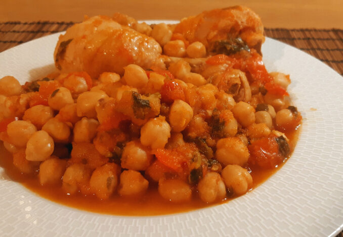 Κλείνουμε με το γρήγορο καπάκι και βάζουμε το μάτι στο 9. Μόλις φτάσει στο σοφτ χαμηλώνουμε το μάτι στο 2 ή 3 και μόλις φτάσει στο turbo αφήνουμε ένα λεπτό. Κλείνουμε το μάτι και περιμένουμε να γυρίσει πίσω ο δείκτης για να ανοίξουμε. Βάζουμε τα ρεβύθια μέσα στην σάλτσα. Ανοίγουμε το μάτι στο 7. Ανακατεύουμε και περιμένουμε να πάρουν μία βράση. Τοποθετούμε το κοτόπουλο και φροντίζουμε να πάει η σάλτσα παντού.