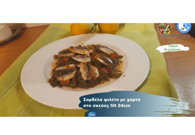 Μόλις ο πρώτος κόκκινος δείκτης φτάσει στην ένδειξη μπριζόλα χαμηλώνουμε το μάτι στο 2 ή 3. Ανεβάζουμε το μάτι στο 7 και προσθέτουμε τα χόρτα. Μόλις μαραθούν προσθέτουμε και τις σαρδέλες και το αλάτι. Ρυθμίζουμε το audiotherm στο καρότο για 20’. Μόλις ο πρώτος κόκκινος δείκτης φτάσει στην ένδειξη μπριζόλα χαμηλώνουμε το μάτι στο 2 ή 3.