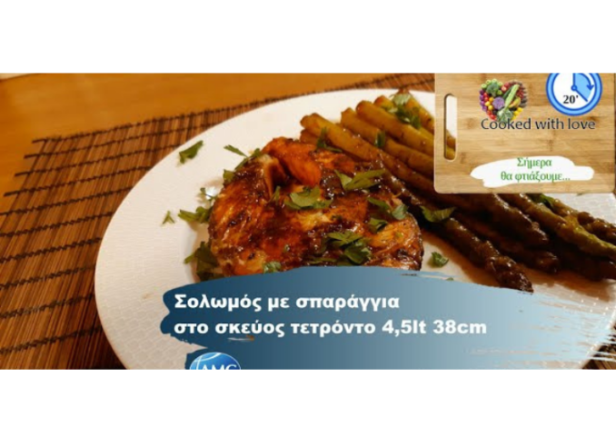 Βγάζουμε από το ψυγείο τον σολωμο και τον στεγνώνουμε με ένα χαρτί κουζίνας. Παίρνουμε το tetrodo και ανοίγουμε το μάτι στο 7. Μόλις ο πρώτος κόκκινος δείκτης φτάσει στο πρώτο χοντρό μαύρο βάζουμε μέσα το σολωμο. Όταν ξεκολλάει τον γυρνάμε, χαμηλώνουμε το μάτι στο 2 ή 3 και προσθέτουμε το σκόρδο πολτοποιημενο και τον χυμό πορτοκάλι. Κλείνουμε το καπάκι και αφήνουμε να μαγειρεύει για 7'. Ανοίγουμε το καπάκι, προσθέτουμε τα σπαράγγια, σοτάρουμε, και προσθέτουμε το τζιντζερ, το αλάτι, το πιπέρι, και τον υπόλοιπο χυμό πορτοκάλι. Κλείνουμε το καπάκι και μαγειρεύουμε αλλά 2'.