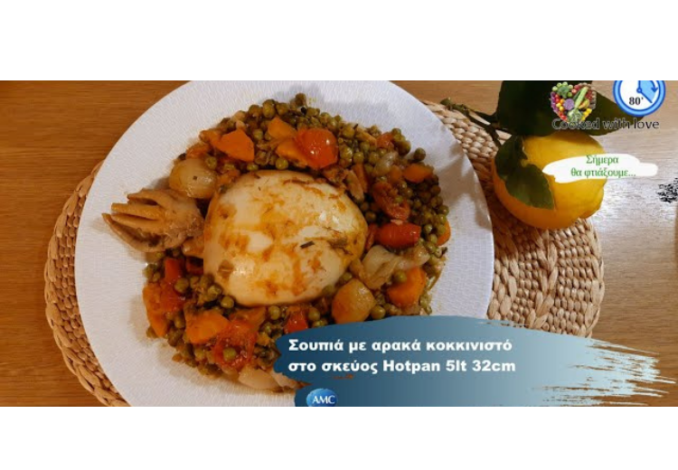 Προσθέτουμε τον αρακά, το σχινόρασο, άνιθο, κολίανδρο, αλάτι και πιπέρι. Επίσης προσθέτουμε ντοματίνια, εστραγκόν, πιπέρια, πελτέ, λάδι και ανακατεύουμε. Βάζουμε τα 6 ξερά κρεμμύδια σε κομμάτια στην κοιλιά της σουπιάς. Την τοποθετούμε στην μέση κάνοντας χώρο στο σκεύος. Κλείνουμε το καπάκι και βάζουμε το audiotherm 1 ώρα στο καρότο.