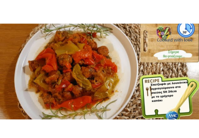 Προθερμαίνουμε το σκεύος στο 7, και ρυθμίζουμε το audiotherm στη ‘μπριζόλα’. Ανοίγουμε και τσιγαρίζουμε τα λουκάνικα και σβήνουμε με το λευκό κρασί. Βγάζουμε τα λουκάνικα και προσθέτουμε τα κρεμμύδια να τσιγαριστούν. Προσθέτουμε τις πιπεριές και όλα τα υπόλοιπα υλικά.