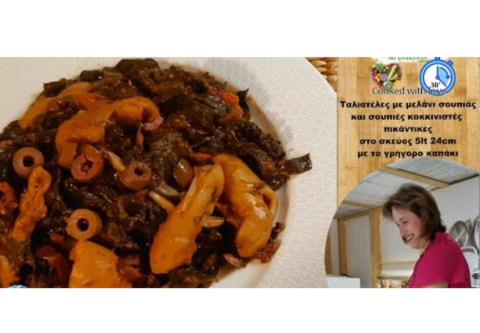 Παίρνουμε το σκεύος 5lt 24cm και βάζουμε το μάτι της κουζίνας στο 7. Βάζουμε το audiotherm στην μπριζόλα και μόλις χτυπήσει ανοίγουμε και βάζουμε μεσα τις σουπιές και τις τσιγαρίζουμε 1 λεπτό από κάθε πλευρά.