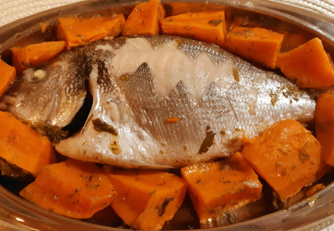 Βάζουμε το ψάρι και τις γλυκοπατάτες κομμένες σε μεγάλα κομμάτια. Βάζουμε το μάτι της κουζίνας στο 9 και κλείνουμε με το γρήγορο καπάκι. Ρυθμίζουμε το audiotherm στα 7 λεπτά στο turbo. Μόλις φτάσει ο δείκτης στο soft, χαμηλώνουμε από το 9 στο 2 ή 3.