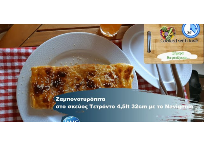 Βάζουμε στο πάτο του σκεύους 1 φύλλο ψησίματος που έχουμε κόψει στο μέγεθος του σκεύους μας Προσθέτουμε το 1ο φύλλο ζύμης Στη μέση της ζύμης προσθέτουμε το τυρί τριμμένο (αλμυρό τυρί), από πάνω βάζουμε εναλλάξ μια φέτα τυρί και μια ζαμπόν. Προσθέτουμε το 2ο φύλλο ζύμης και αλείφουμε με το αυγό (νερομένο με 1 κουταλιά της σούπας νερό αν θέλουμε). Ανοίγουμε το μάτι της κουζίνας στο 3 και βάζουμε το navigenio στο 3ο πεδίο για 25 λεπτά.